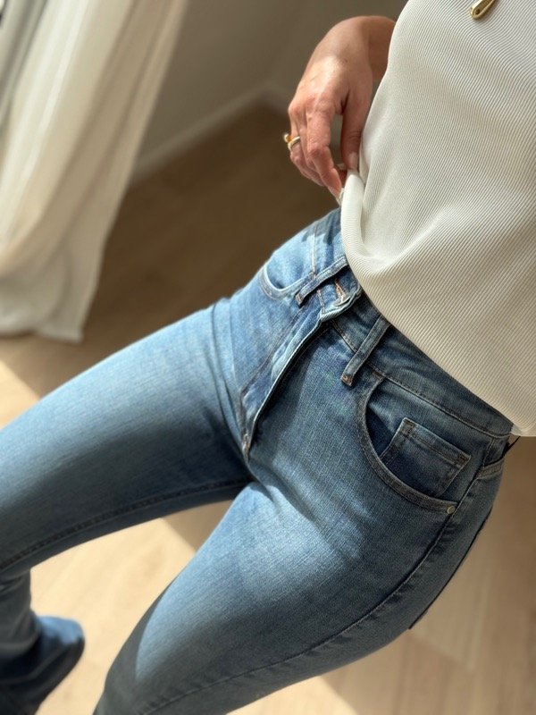 Jean 5 bolsillos, tiro alto, y ajusta en cintura, cadera y muslos.
