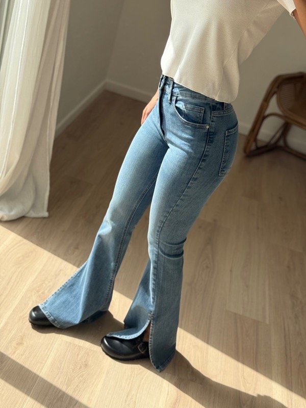 Largo y apertura son full. Botamanga con ruedo convencional, y detalle de tajo externo.