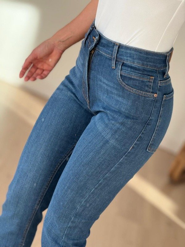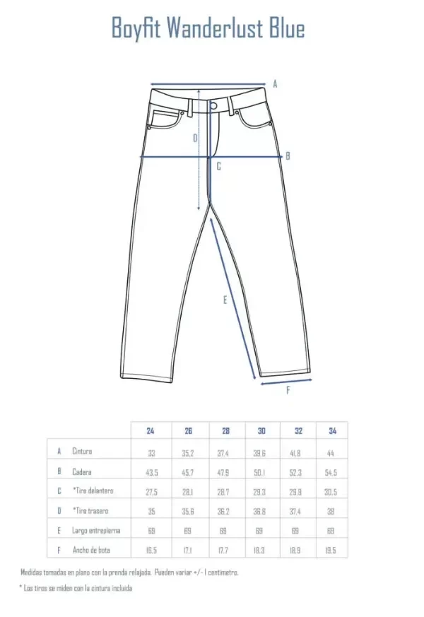 WANDERLUST es un jean 5 bolsillos, de tiro medio, ajustado en cadera y muslos, con sutil holgura en piernas.