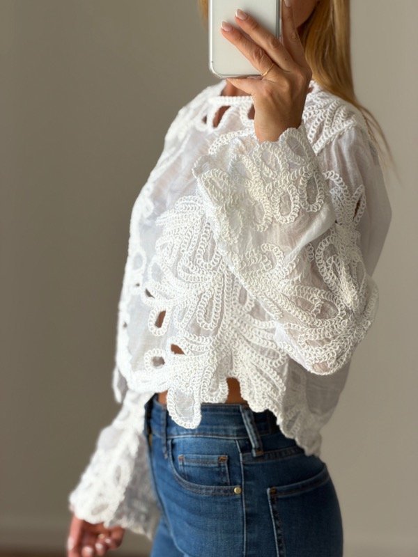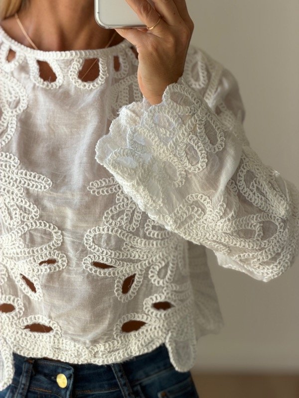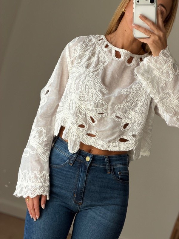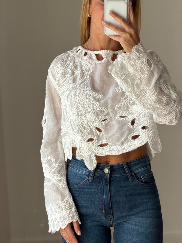 Blusa de poplin bordada calada con detalle abajo y en mangas modelo crop.