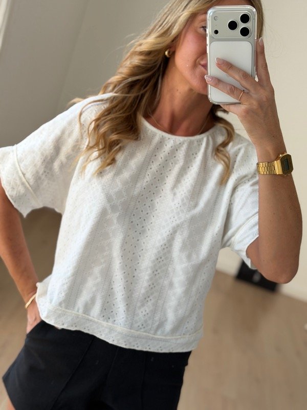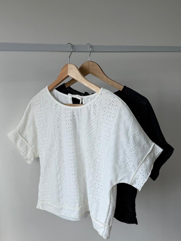 Blusa algodón broderie calada, espalda gota con tira para atar con terminación de maderitas.
