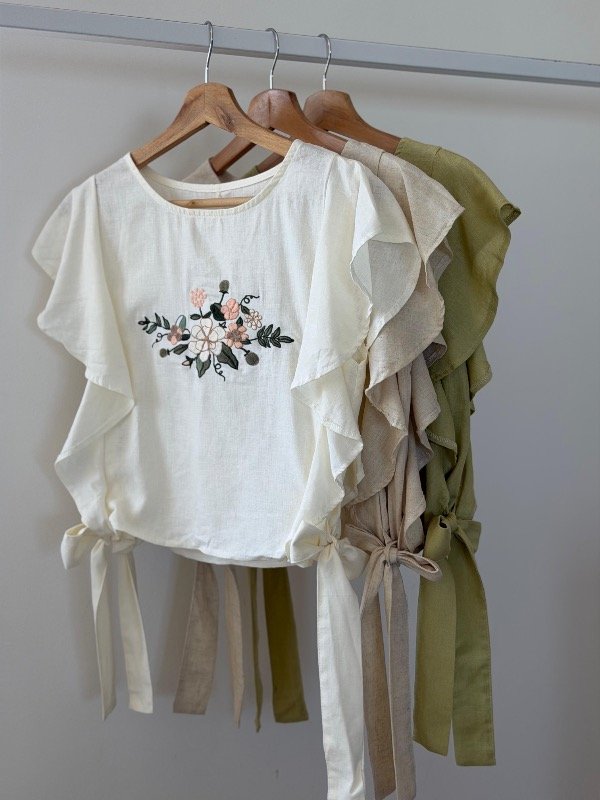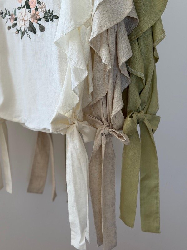 Blusa lino bordada con volados laterales y lazos a los costados.