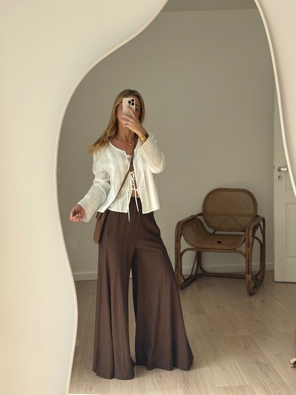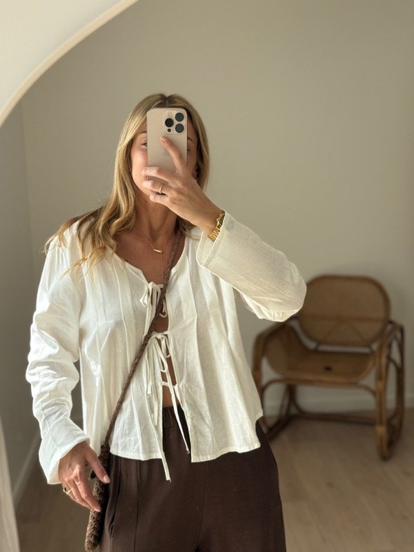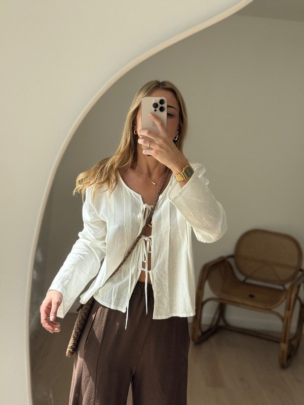 Blusa de lino con tablitas con tiras para atar en el frente.