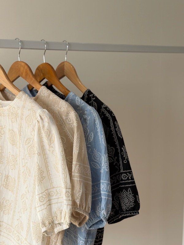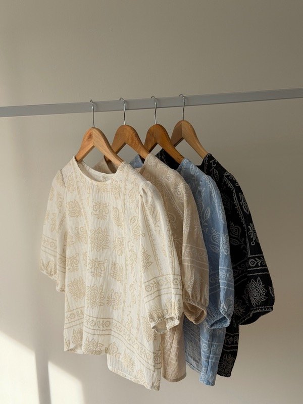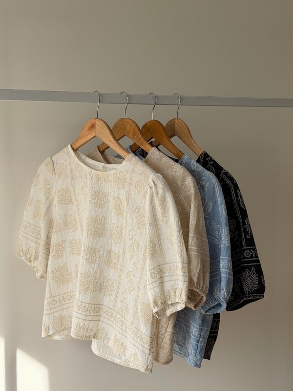Blusa lino estampado elástico en mangas con frunce en hombros .