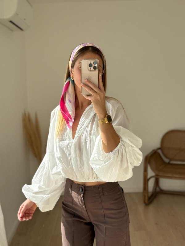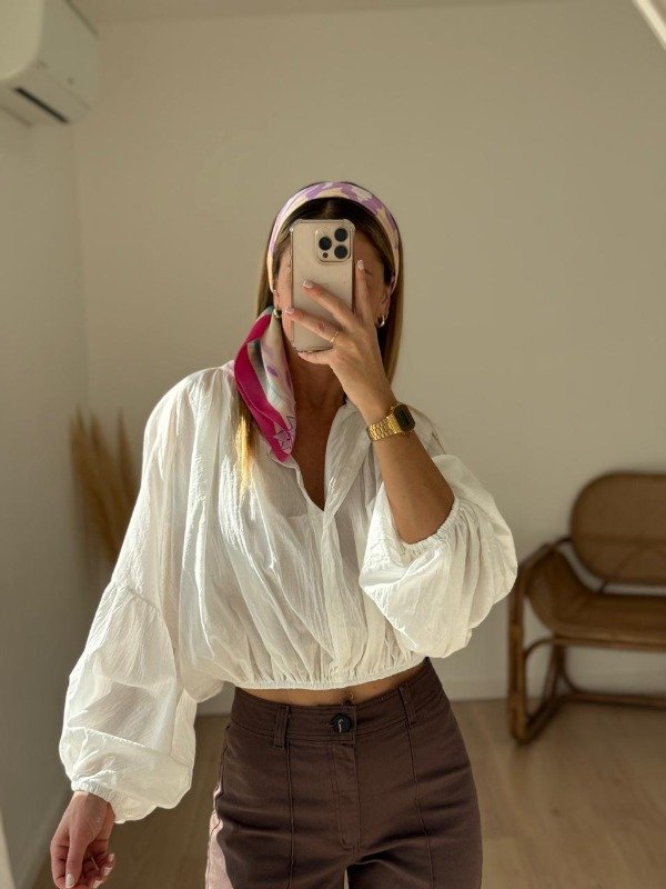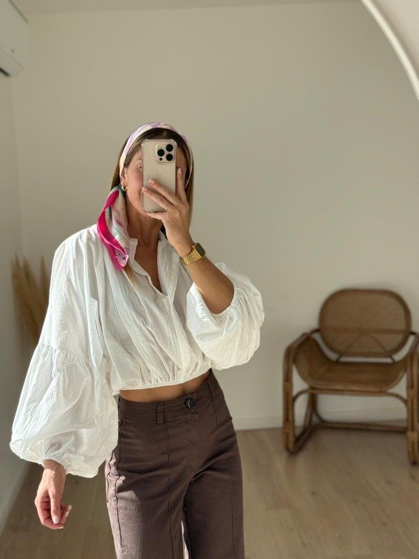 Blusa algodón madrileño manga globo. Elástico en mangas y cintura modelo crop.