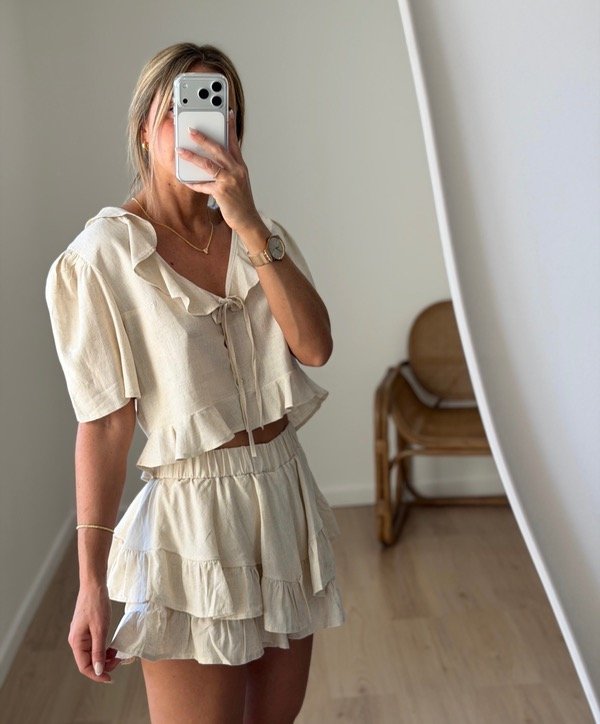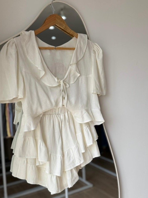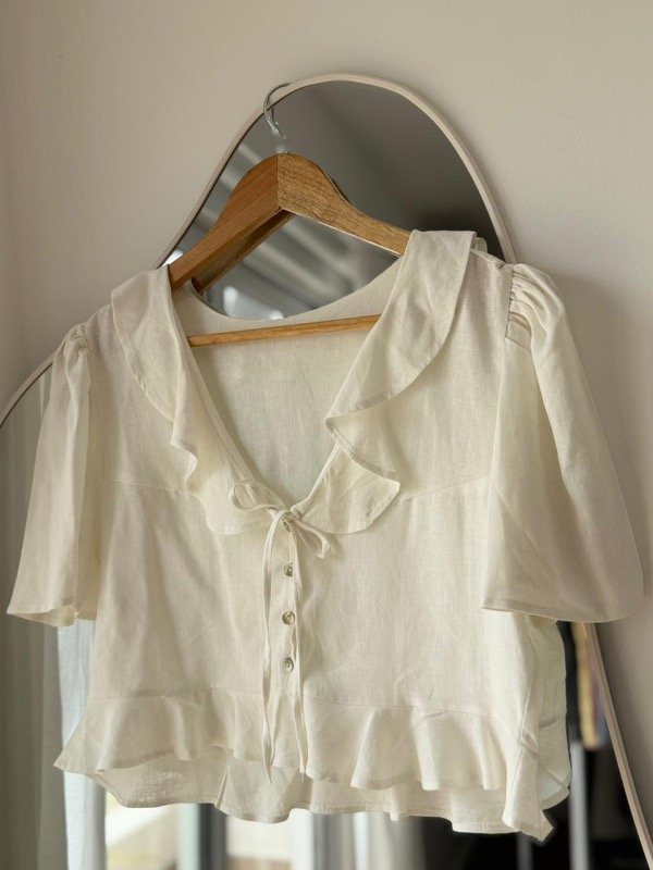 Blusa crop con botones y tirita para atrás , volado en cuello y abajo, manga con frunce.