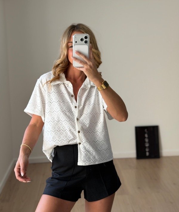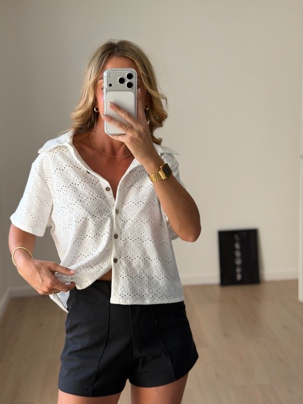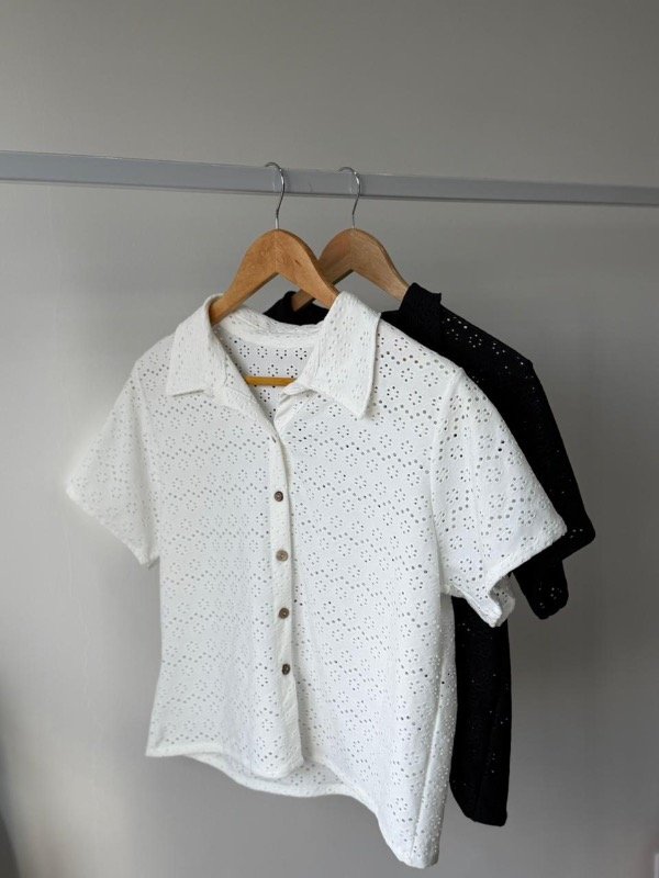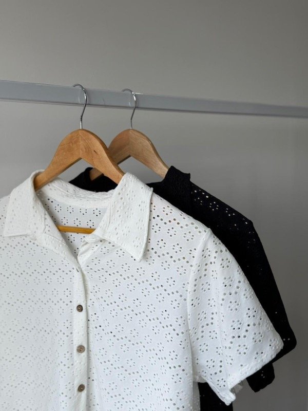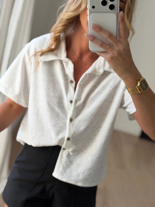 Camisa algodón broderie calado mangas cortas con botones de madera.