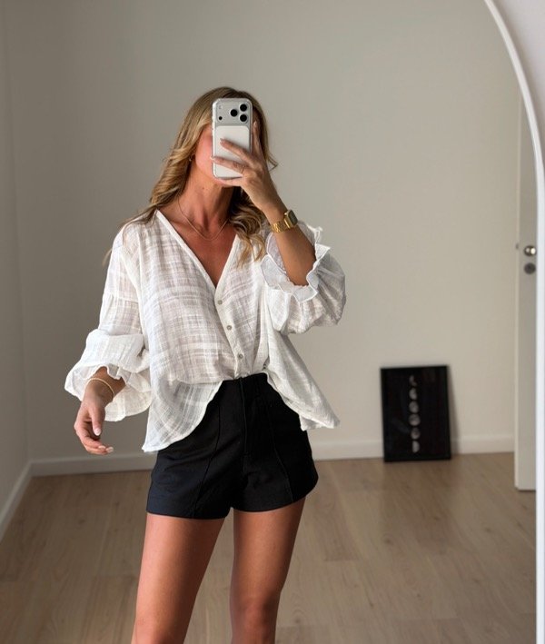 Camisa lino tramado con botones nacarados elástico en mangas.