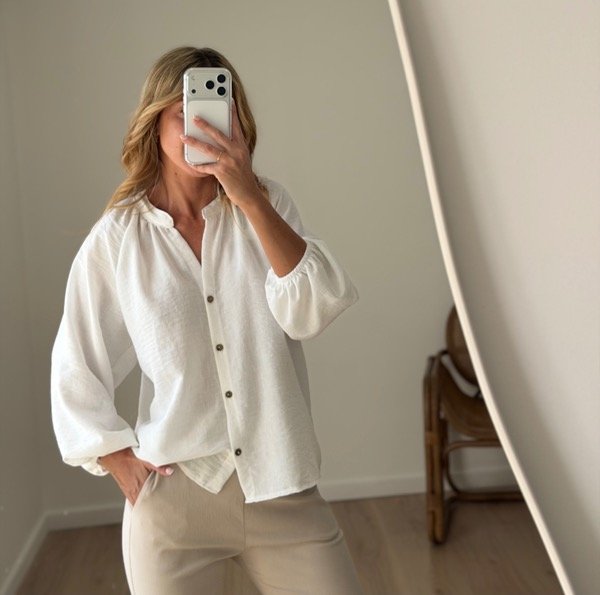 Camisa lino madrileño cuello mao en V con botones de madera y elástico en puños.