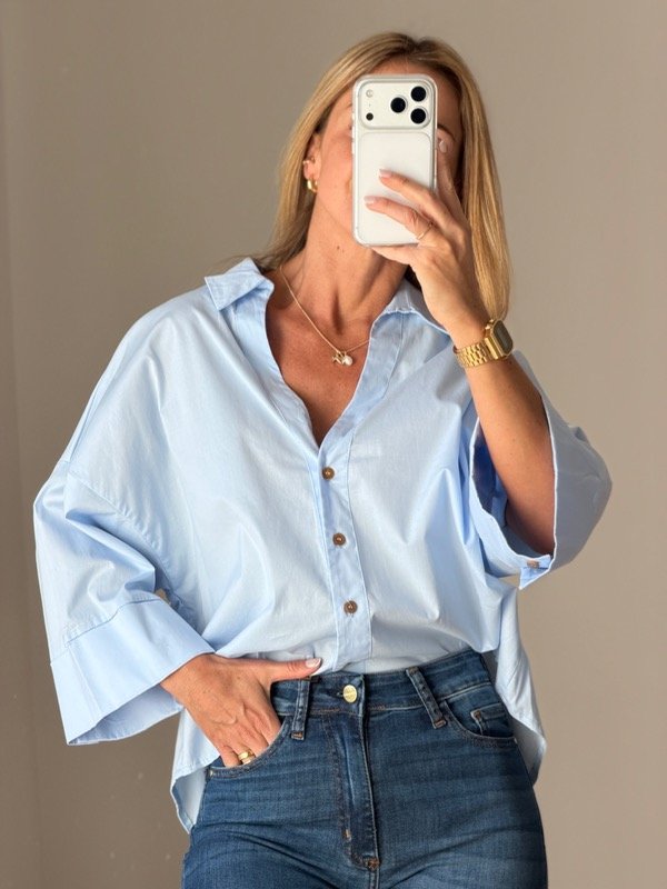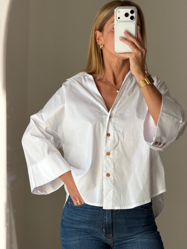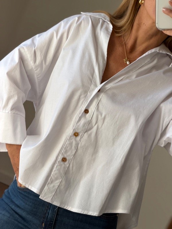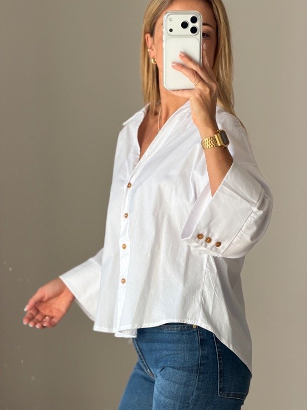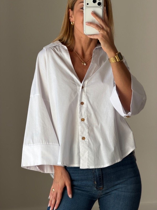 Camisa de poplin elastizado cuello V, mangas 3/4 ancha , tablita en espalda.