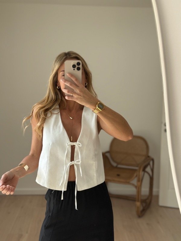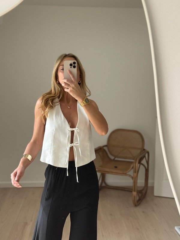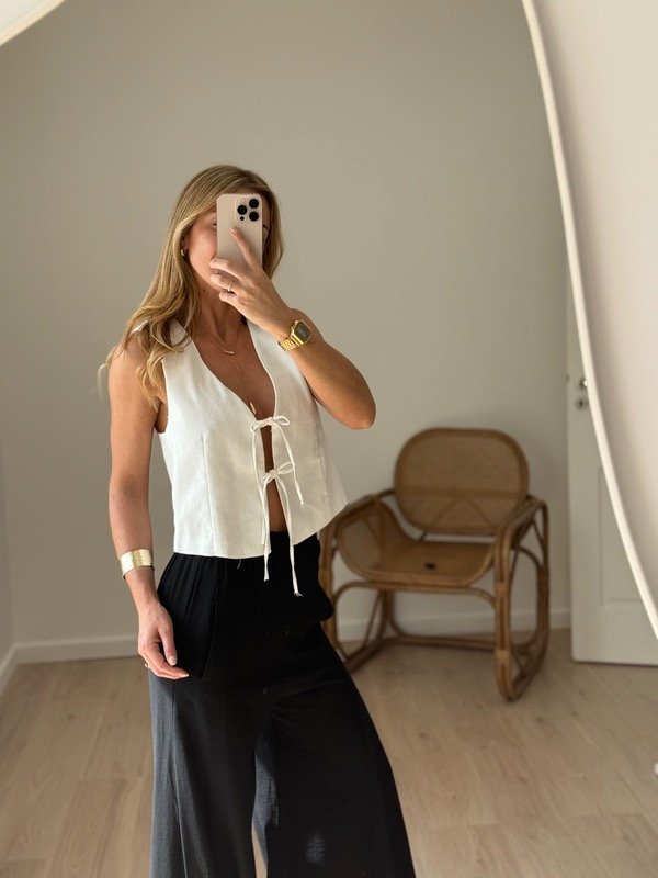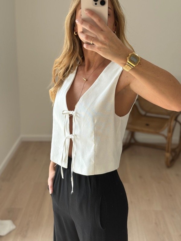 Chaleco de lino forrado, con tiritas para atar, excelente terminación.