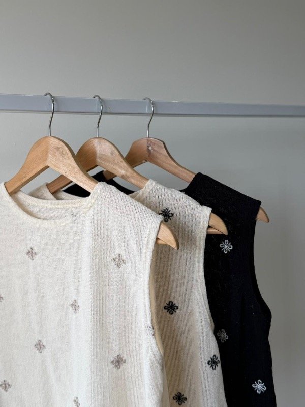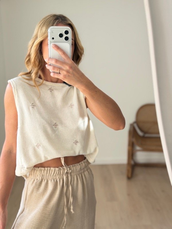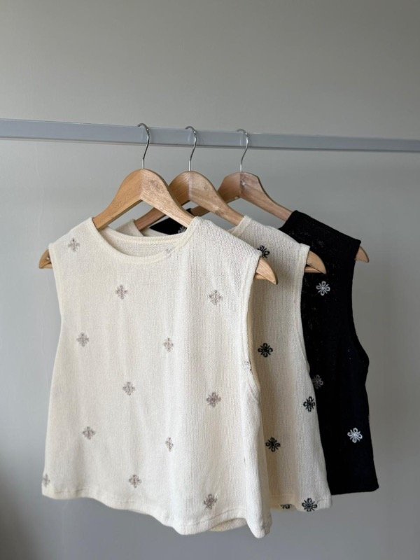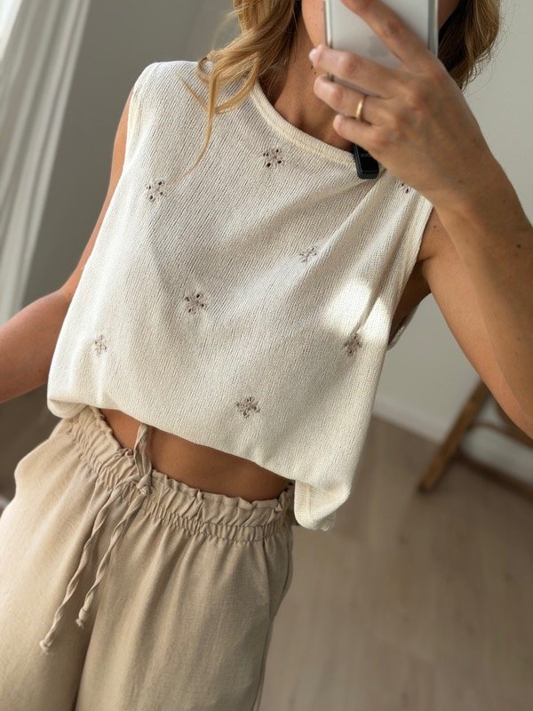 Musculosa tejida bordado flores semi crop .