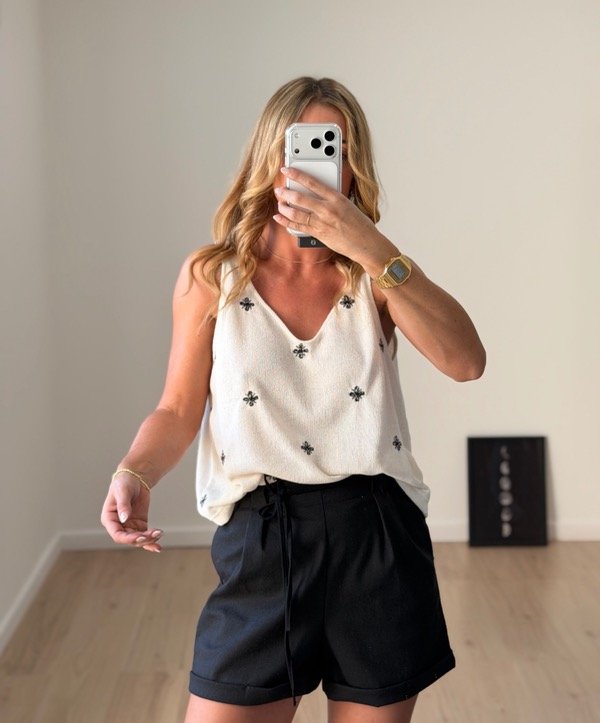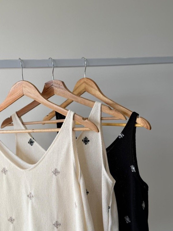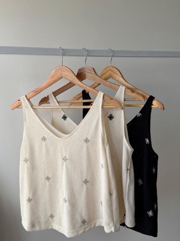 Musculosa tejida, bretel, cuello en V semi crop evase bordado flores.