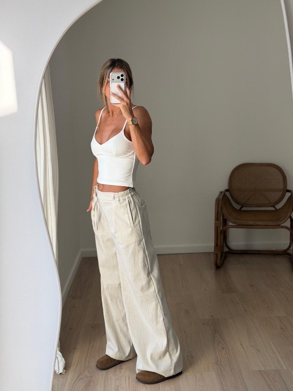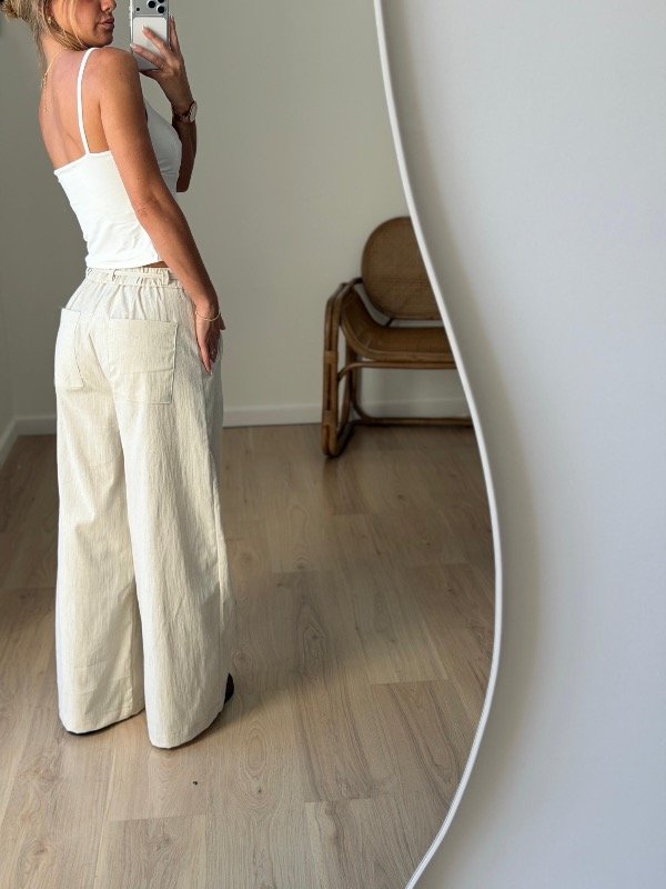 Pantalón palazzo lino con tira con bolsillos , elástico atrás !