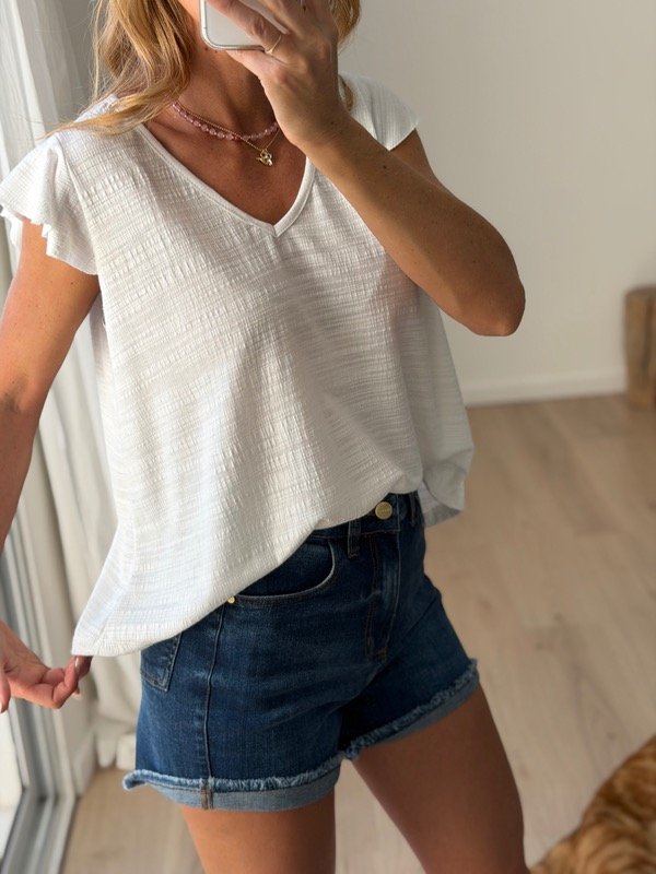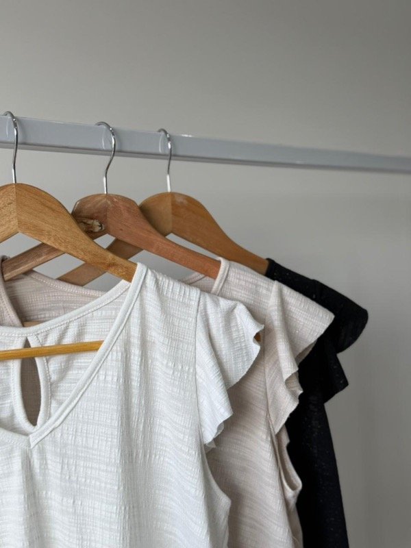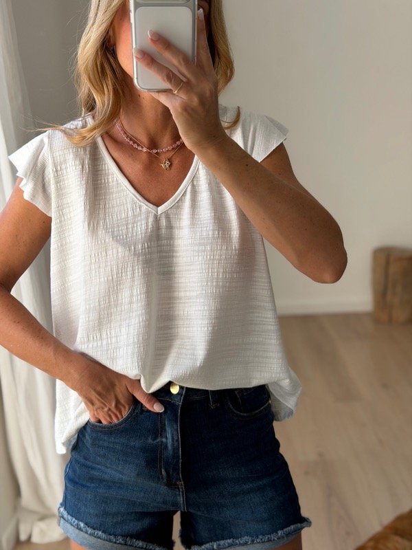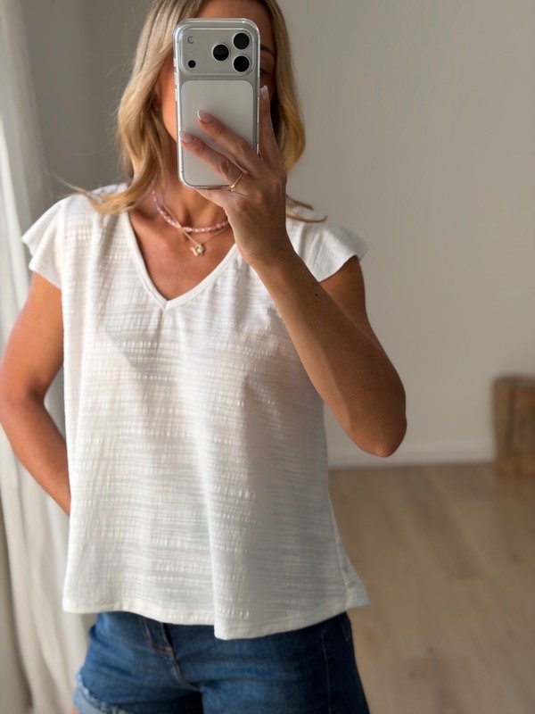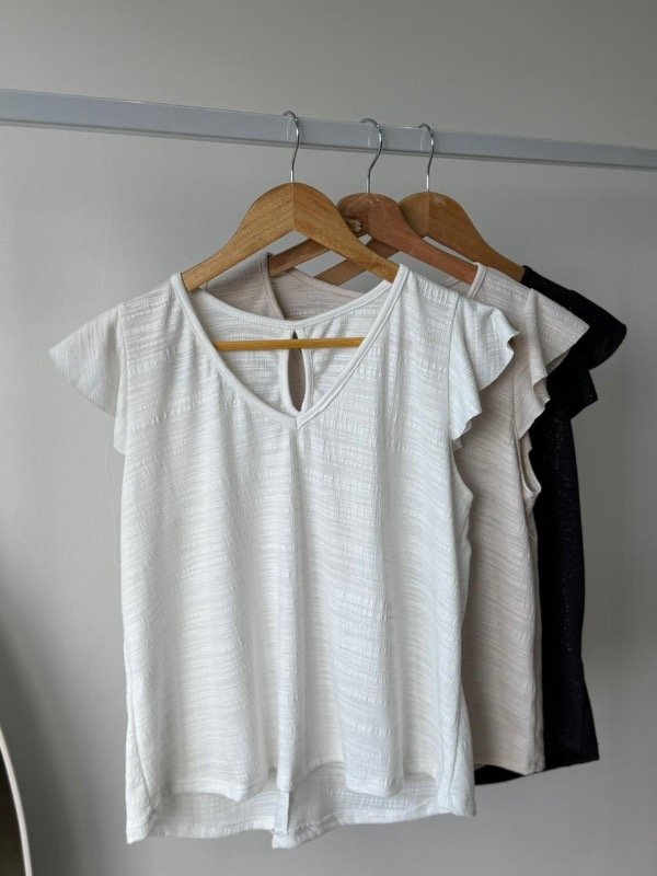 Remera algodón liviano tramado con lurex cuello V espalda Hita y volados en hombros , evase .