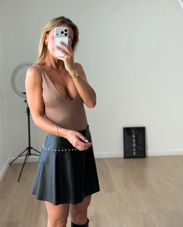 Pollera eco cuero volado, tachas y cierre .