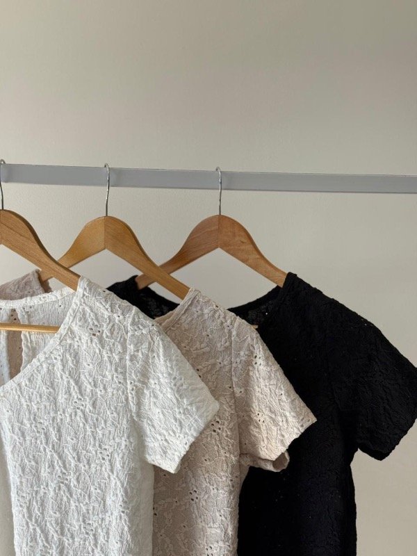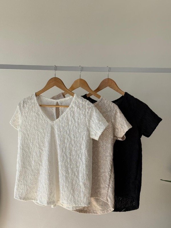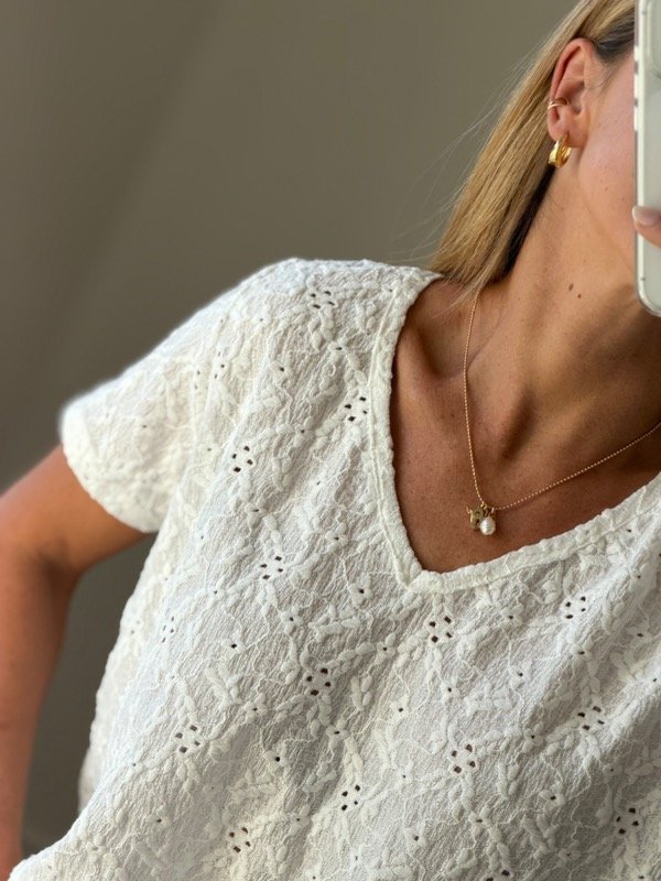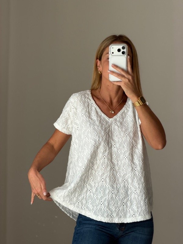Remera algodón broderie cuello V con gota en espalda, redonda abajo más larga atrás.